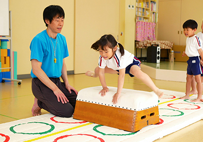 カワイ体育教室専門インストラター指導のもと、マット運動、跳び箱、鉄棒、縄跳び等からだを動かし楽しんでいます。