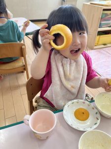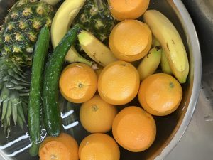 パイナップル🍍とオレンジ🍊ときゅうり🥒と未満児クラスのオヤツのバナナ🍌