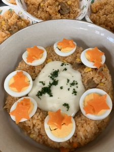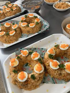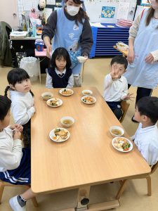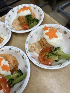 先生たちが盛り付けしている間もちゃんと座っていましたよ。