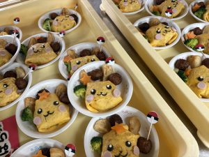 さくらさんはお弁当箱にピカチュウ、肉団子にモンスターボールのピックを付けました。(ピカチュウに見えるかドキドキでした)